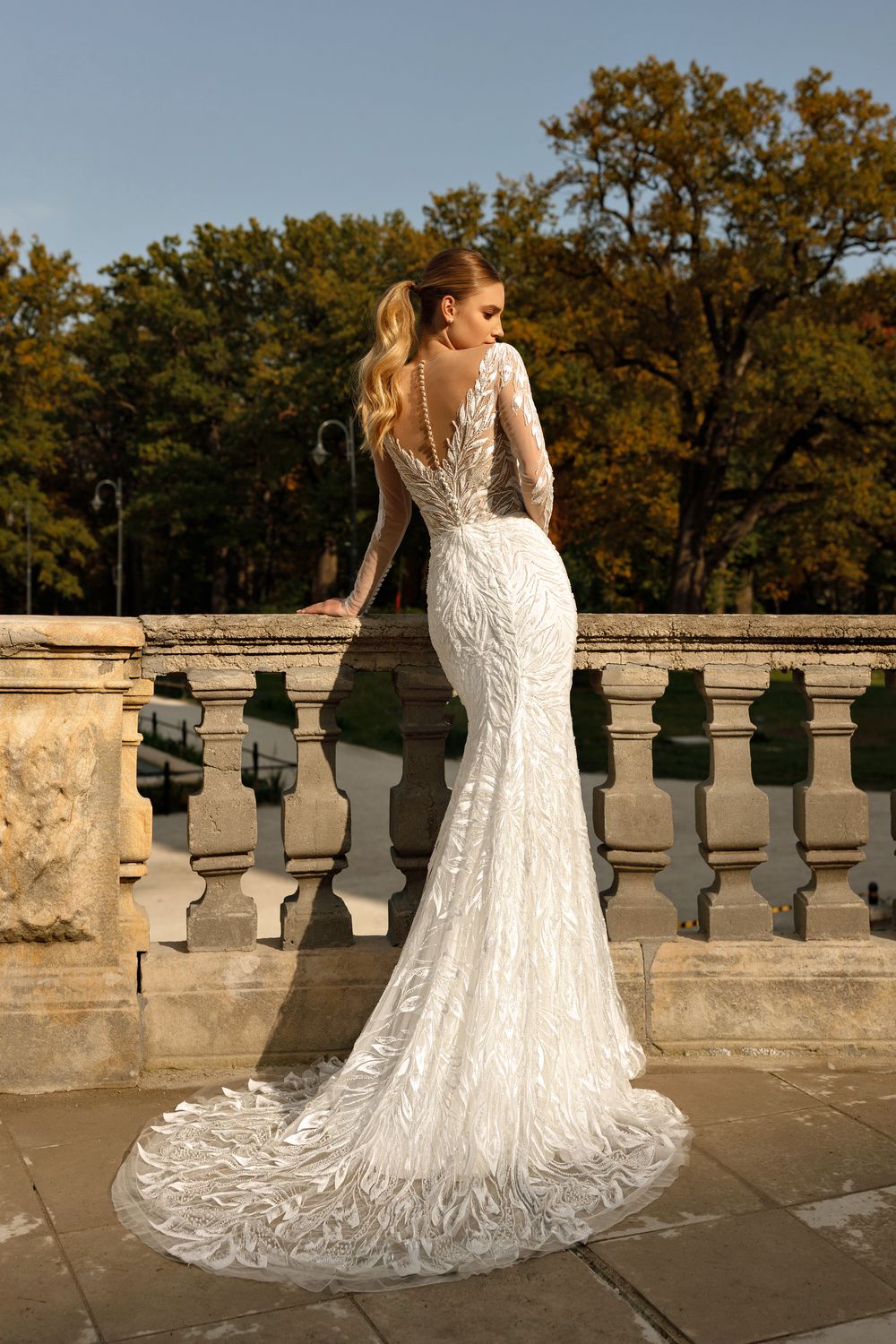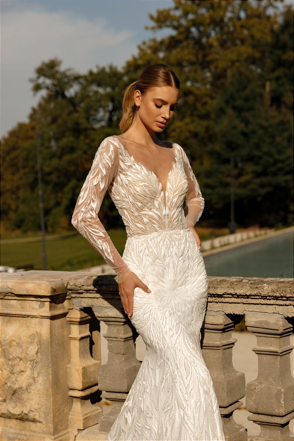Chic wedding dress with a semi- transparent lace - adorned bodice with long sleeves and a long train.