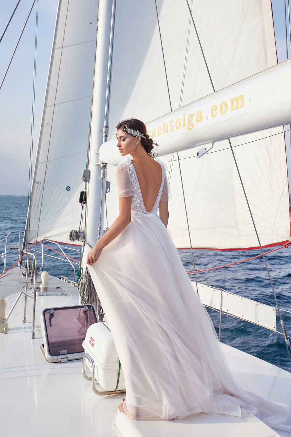 Translucent, weightless, with a light powdery tint and a minimum of decor is all a description of a delicate dress with a surprise in the form of a bare back