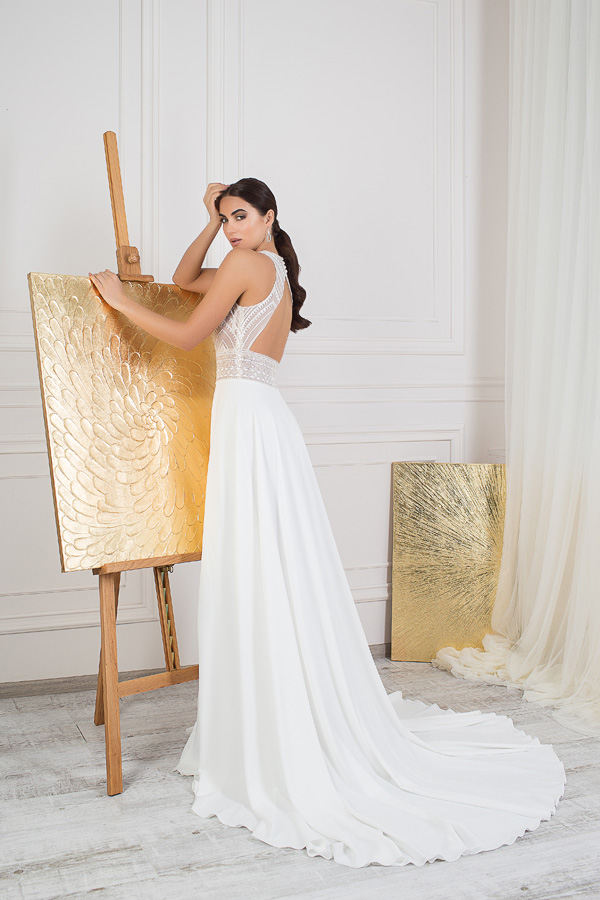 An incredibly popular American silhouette and an emphasis on the waist in the form of a wide lace belt will show all the beauty of the owners of ideal parameters. A high cut on the skirt will add piquancy to the image