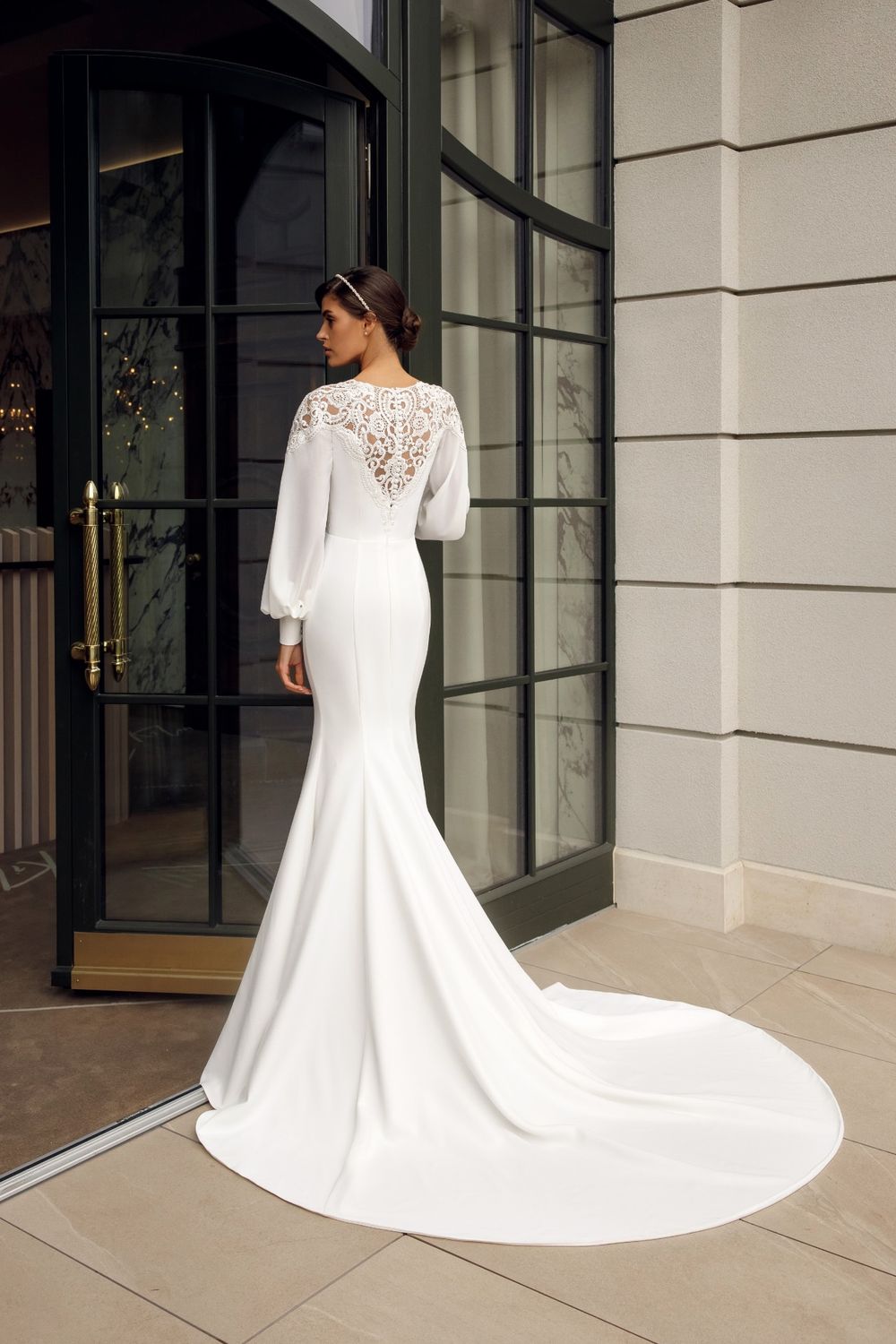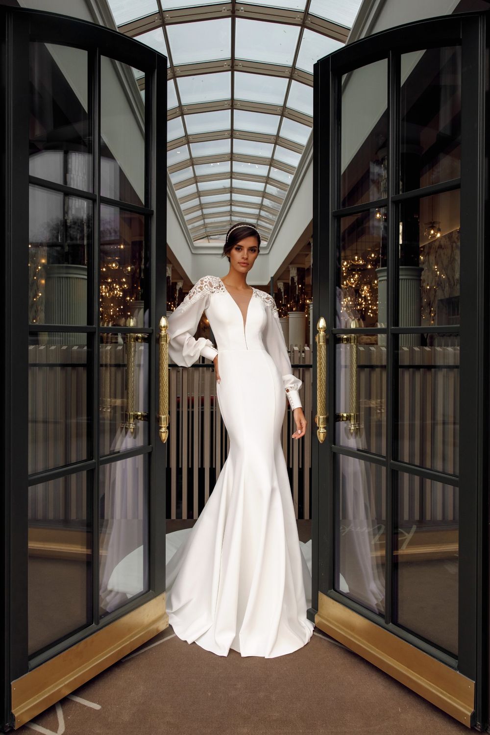 silhouette of a mermaid - an emphasis on lace shoulders, voluminous sleeves and