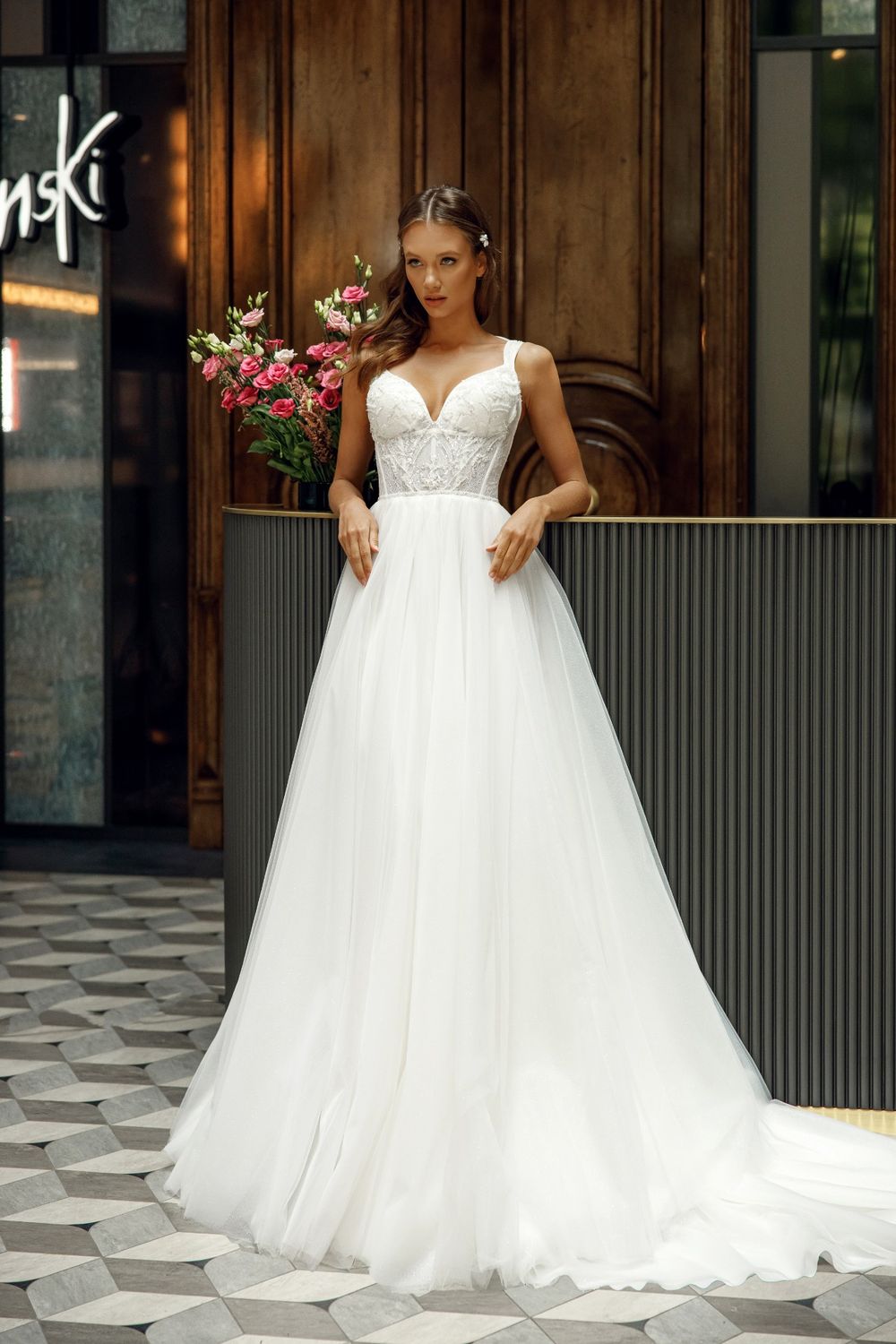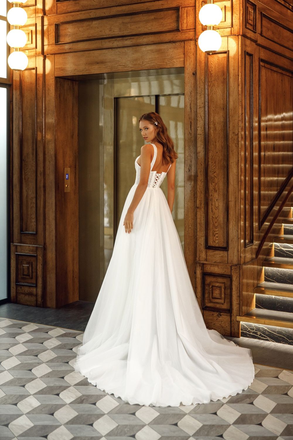 The accent on the corset is made of delicate lace and an interesting geometric neckline.