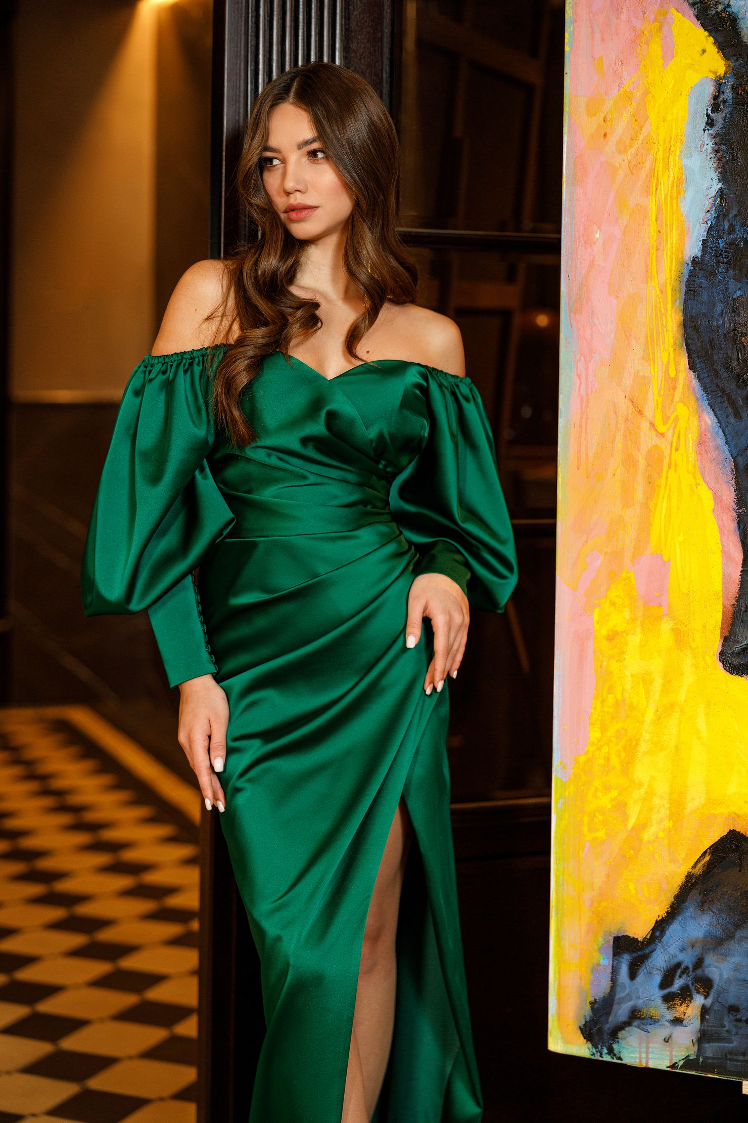 elegant dress with open shoulders and sexy neckline on the leg