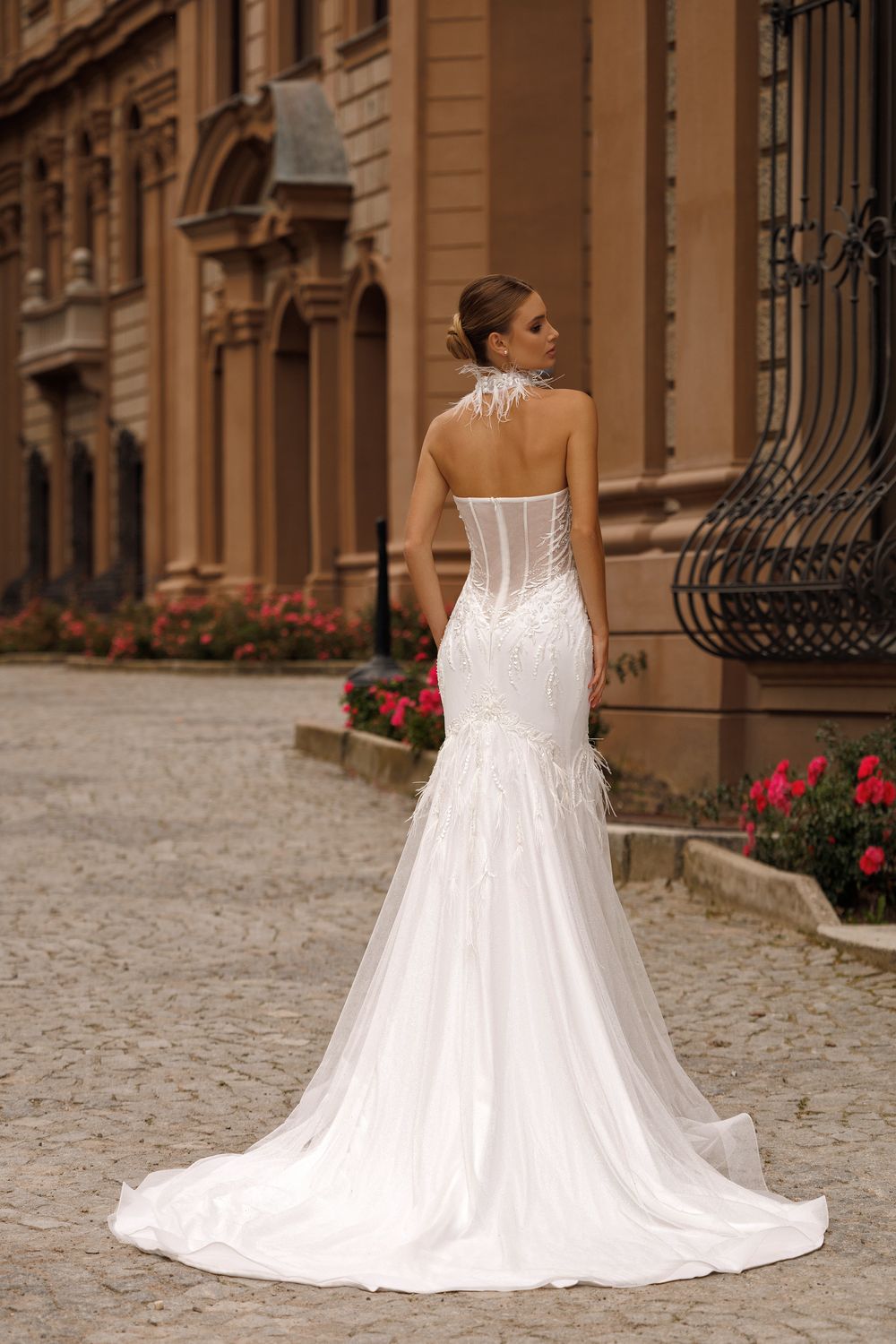 Elegant mermaid wedding gown with a classical heart - shaped bodice decorated with feathers and a long train