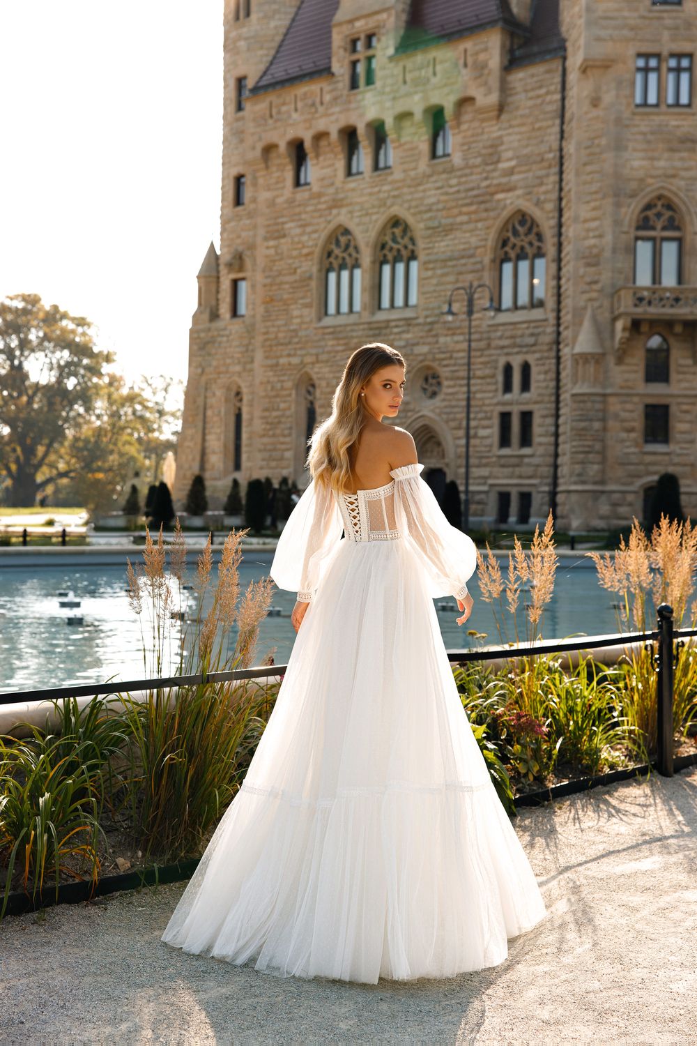 Tender wedding gown of - the - shoulder with macrame lace in Boho style