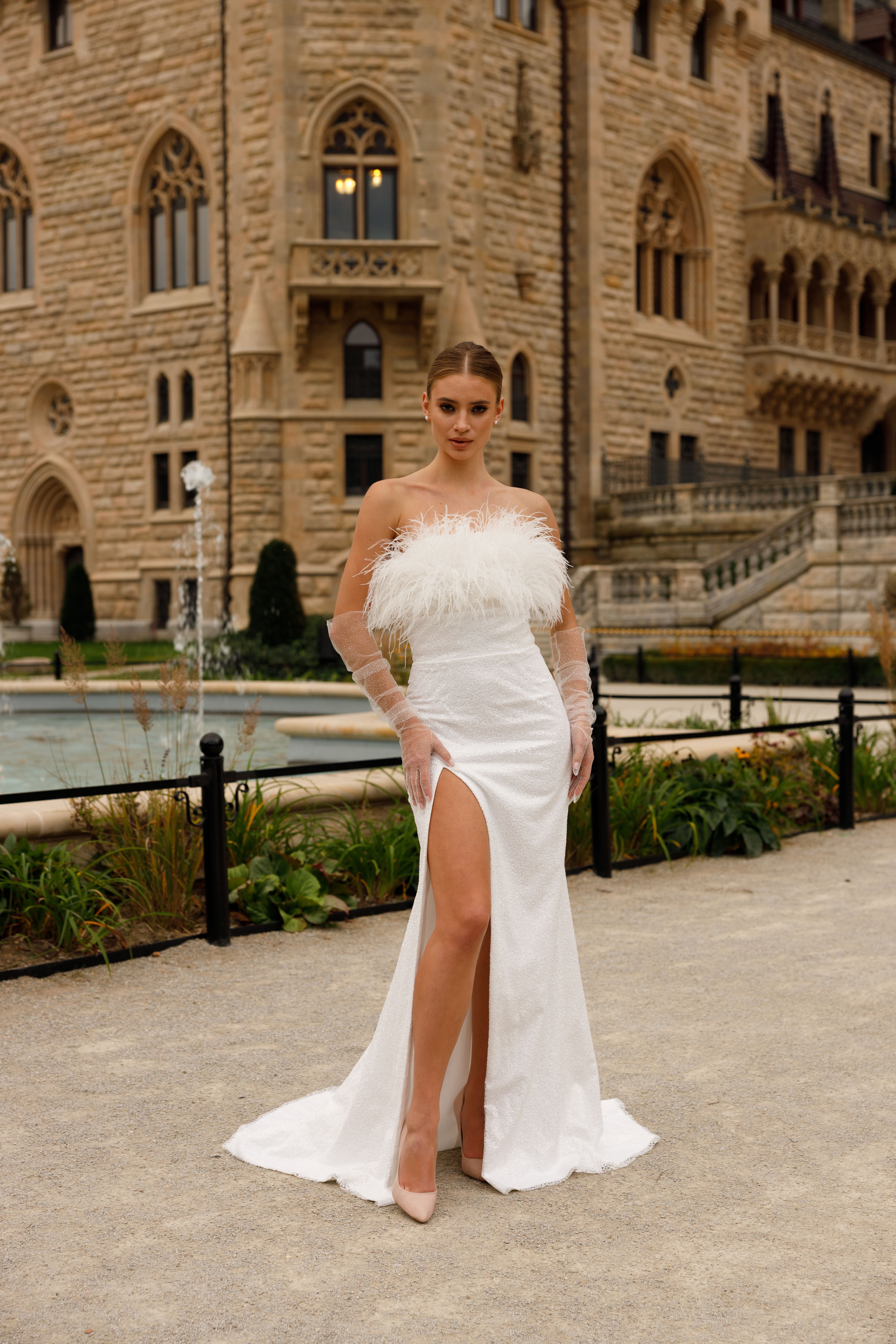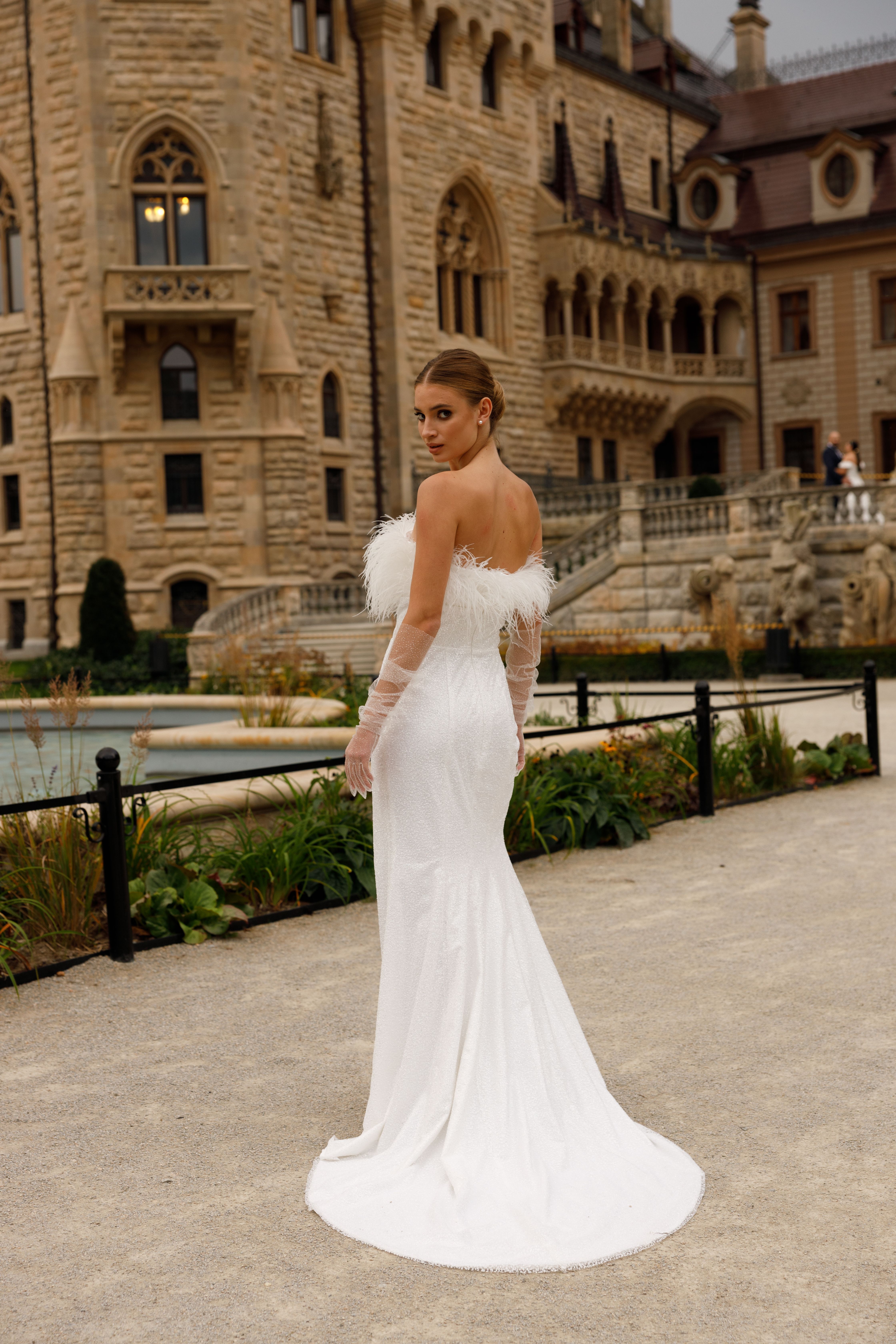 Exclusive sparkly silhouette dress with slit and decorated with feathers