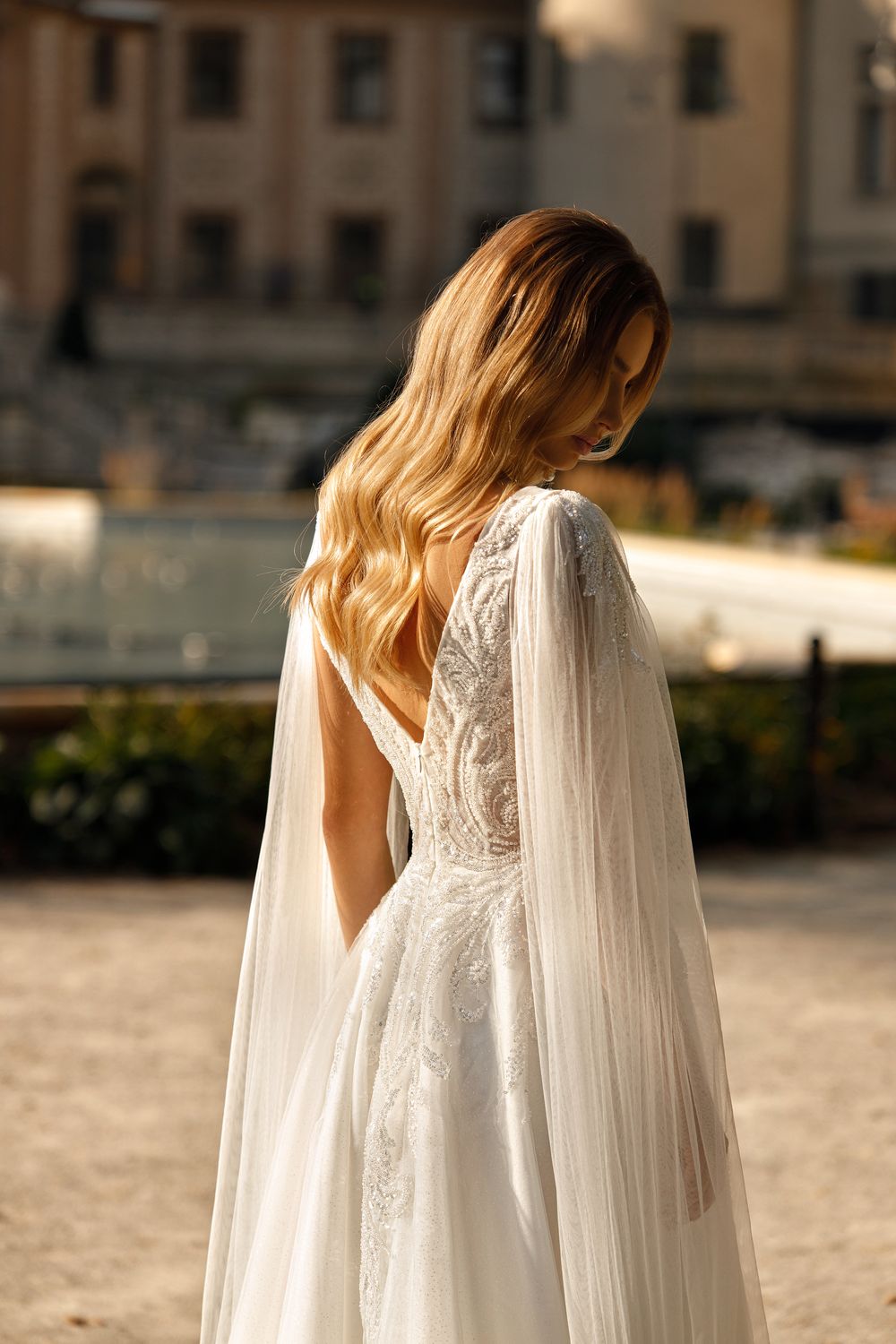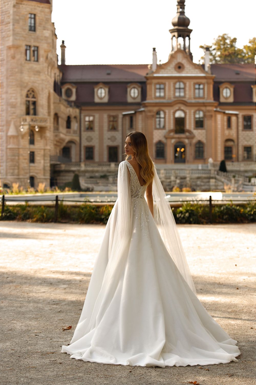 Tender A-line wedding gown with a tulle skirt and glitter and tulle sleeves