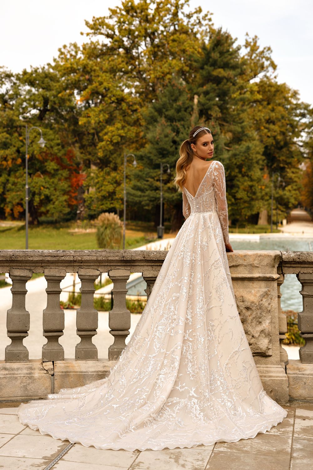Sparkly powder A-line gown with a long sleeves for real princess
