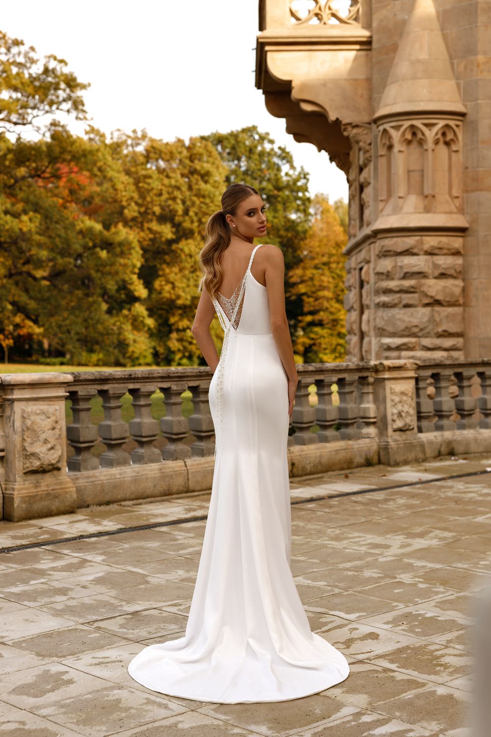 Draped of- the -shoulder silky satin gown with a V-neckline, daring thigh slit and medium train