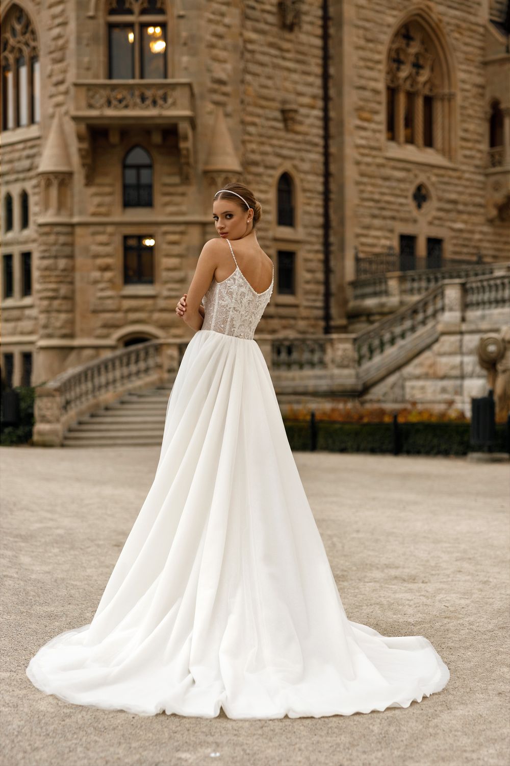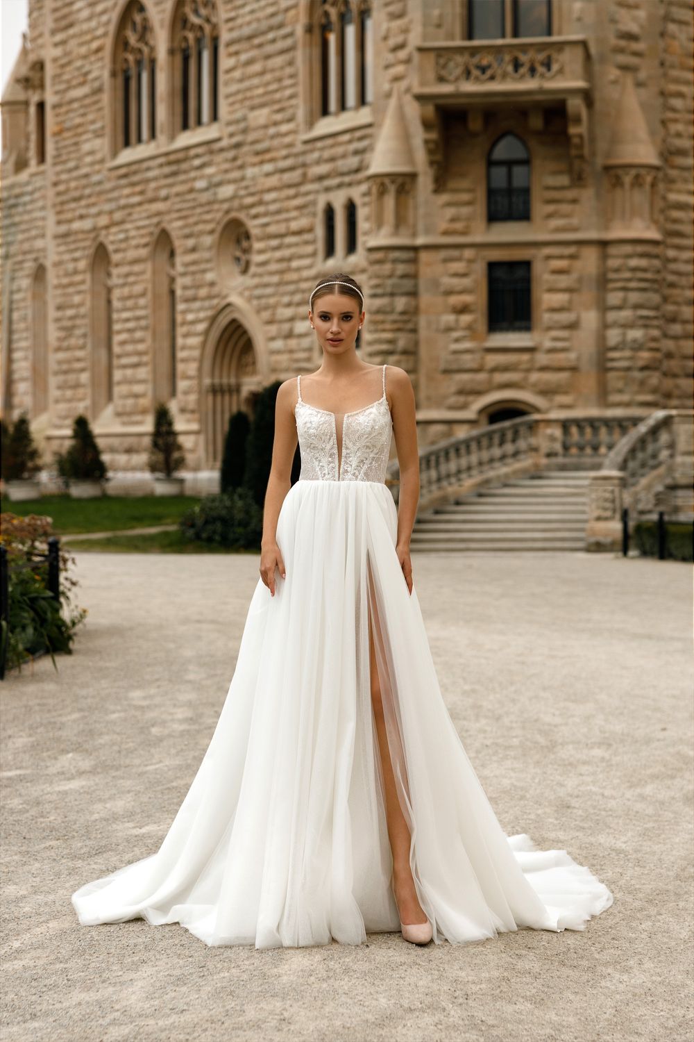 Light wedding dress with a deep cut and tender tulle skirt